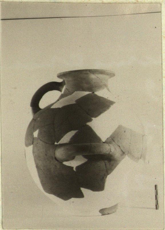 Description:   Walls fragmentary but profile complete; one horizontal handle missing. Plump body low ring foot; flat projecting rim.