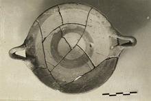 ADDENDA P 18546: Flat-bottomed shallow plate with plain rim and two broad ribbon handles attached at rim. Unglazed except for two wide bands on the floor, and the handles.