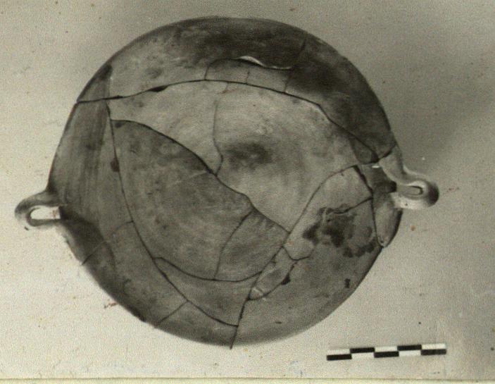 | Description: | Mended from many pieces; complete. Roughly wheelmade, with flat bottom and plain rim. Two ribbon handles at rim. Unglazed, except for traces of thin wash on and around handles, no bands on floor. Much burned. | |
