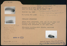 | Description: | About half preserved with all of one edge and corner and part of the curved end. One string hole preserved at the open end. Micaceous cooking ware fabric, unglazed and undecorated. | |