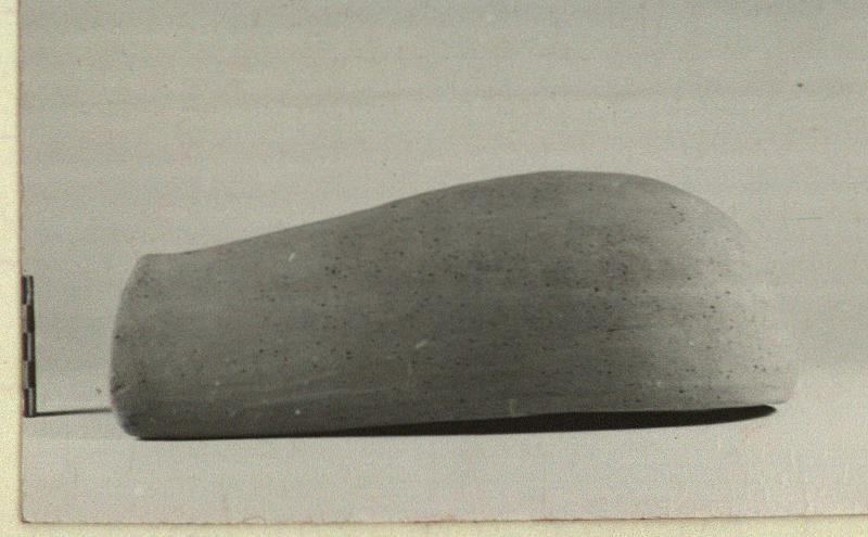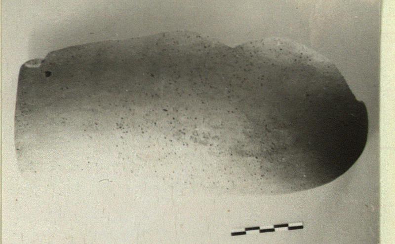 | Description: | About half preserved with all of one edge and corner and part of the curved end. One string hole preserved at the open end. Micaceous cooking ware fabric, unglazed and undecorated. | |