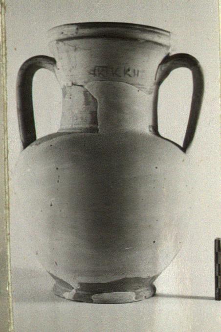 | Description: | Very fragmentary, but the profile complete. Ring foot; ovoid body; rather broad nearly straight neck with vertical lip grooved and ridged around the outside. Band handles from shoulder to below lip. Neatly made of pink clay with fine pale buff slip. Incised on the neck: seven and one-half kotylai (or kythoi?): <graphic> | |