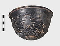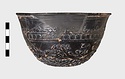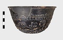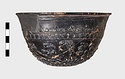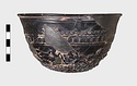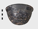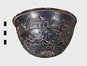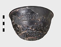 Description:   Mended from many pieces; small part of rim and walls missing. In medallion, small head (Athena Parthenos?). Above, five rows of small ribbed leaves. In the figured zone, hunters on horseback and afoot attacking a wild boar(?) with dogs, one of which has leapt onto the boar's back. Erotes in the field. Upper zone, a band of rosettes surmounted by double spirals topped at intervals by small leaves.