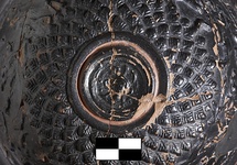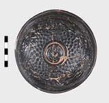 Good black metallic glaze. Miltos prominent in the scraped groove beneath the rim and around the medallion.