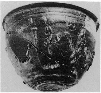| Description: | Mended from several pieces; fragmnents of rim and wall missing. Restored in plaster. Plain medallion; around it a rough leaf pattern(?). On the figured zone, two personages, irregularly repeated, with an oval object (wreath) in the field between. One figure, partly draped, stands left before a narrow pillar(?); the other, draped, stands facing, carrying a pitcher in her right hand. Above, a band of ovolo, upside down. Miltos in the groove around the medallion and for a line below the rim. Black to brownish glaze. | |