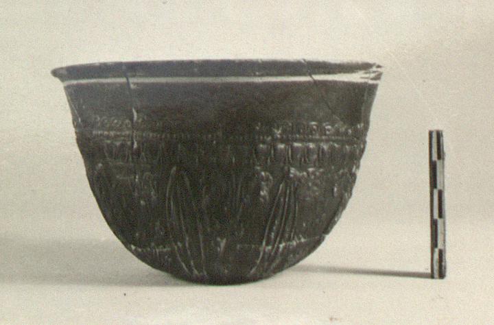| Description: | Mended from several pieces; about half the rim and part of the wall missing. Restored in plaster. Medallion, a small rosette surrounded by very small leaves and a leaf and tendril motif, alternating to form narrow panels. The tendrils blossom at the top into pairs of flowers of several different sorts. Upper zone, band of ovolo, then line of beading; above this, running spiral. Dull black glaze. | |