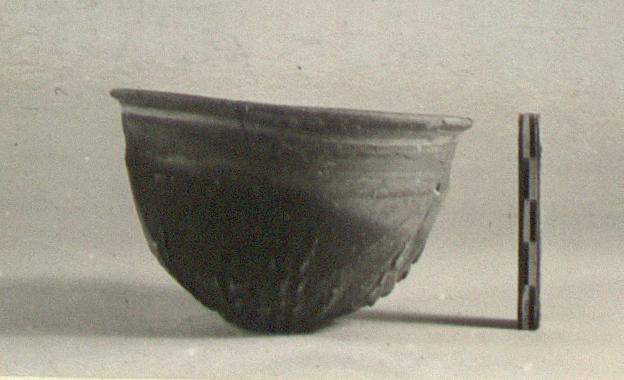 Description:   Small bowl mended from several pieces; part of wall missing. Restored in plaster. Large rosette, indistinct in medallion; a scraped band around, slightly raised to form a foot. Rough chevron-leaf motifs alternating with plain spikes, reaching only part way up wall. Rough, slightly raised band at top of wall; no upper decorative zone.