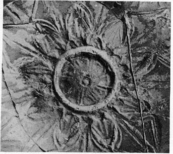 | Description: | The bottom preserved and a small part of the rim and wall. Restored in plaster. Medallion, large rosette. A ring of small leaves around; then a zone of triangular leaves; above this, the wall is covered with large triangular leaves, overlapping, those of the lower zone tapering below to broad stems. Upper zone, lightly raised band between two raised lines; no ornament. Glaze dull black inside and around upper part of outside; dull red below. | |
