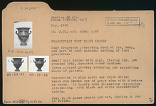 | Description: | Many fragments preserving much of rim, body, and part of both handles; nothing of foot preserved. Restored in plaster. Small bell krater with high, flaring rim, low rounded body, incurved round handles. Three scraped grooves bordering and separating bands of pattern. Decoration in clay paint and thick white: below rim double row of grape vine with clusters in white. In handle zone concentric rectangles alternating with black and white checkerboard panels. Dull black glaze inside and out, shading to red at bottom. | |