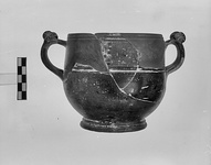 | Description: | Mended from many pieces; most of rim missing. Restored in plaster. Slightly profiled ring foot, low round body continuous with slightly inclined, straight rim; vertical band handles with rotelle on upper curve. Decorated zone just below rim in clay paint and thick white: concentric rectangles in clay paint alternating with narrow black and white checkerboard panels. Clay paint star in each rotella. Scraped grooves, two above and one below painted band. Dull black to red glaze, badly worn. Miltos in grooves. | |