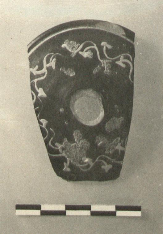 | Description: | Knob and two sides missing; part of rim preserved. Almost flat lid with vertical rim and beginning of raised knob; scraped groove around upper edge. Decoration in clay paint: wreath of long-stemmed ivy leaves. Slightly metallic black glaze over all. Cf. P 10736. | |