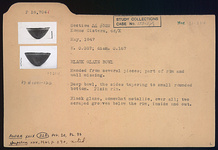 | Description: | Mended from several pieces; part of rim and wall missing. Deep bowl, the sides tapering to small rounded bottom. Plain rim. Black glaze, somewhat metallic, over all; two scraped grooves below the rim, inside and out. | |