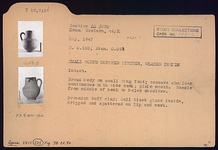 Description:   Intact. Broad body on small ring foot; concave shoulder continuous with wide neck; plain mouth. Handle from middle of neck to below shoulder.