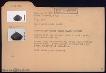 | Description: | Mended from two pieces; part of wall, neck, and handle missing. Broad, low, double-conical body; flat bottom; narrow neck. Lower handle attachment near point of greatest diameter. Dull black glaze outside. | |