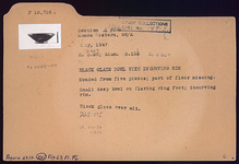 | Description: | Mended from five pieces; part of floor missing. Small deep bowl on flaring ring foot; incurving rim. Black glaze over all. Cf. P 26154, P 11452. | |