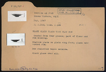| Description: | Mended from four pieces; part of floor and rim missing. Shallow plate on plain ring foot; plain out-turned rim. Two rouletted bands outside. Black glaze over all. | |