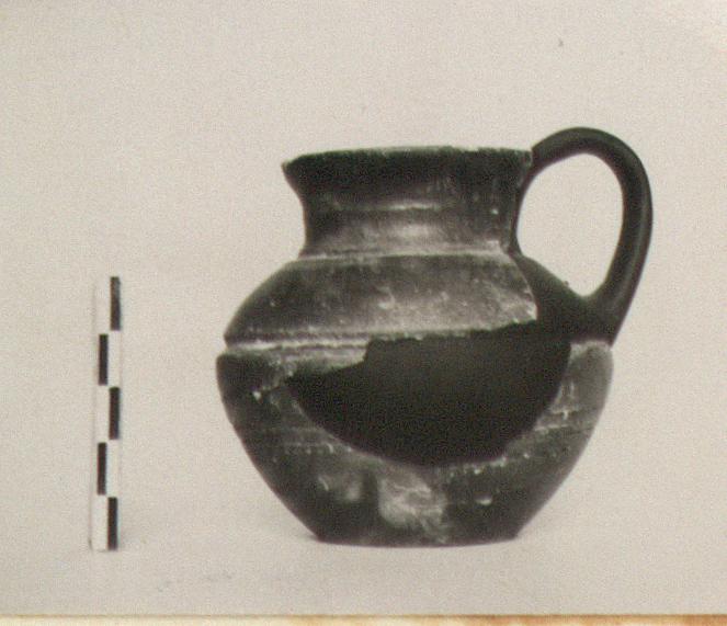 | Description: | Mended from two pieces; part of rim and wall missing. Restored in plaster. Deep broad body; bottom depressed so that lower edge of wall forms false ring foot; broad neck with round mouth and rim slightly flaring. Two scraped grooves outside, one between body and neck, the other on the point of greatest diameter; light grooves on lower body. Glazed over all. | |