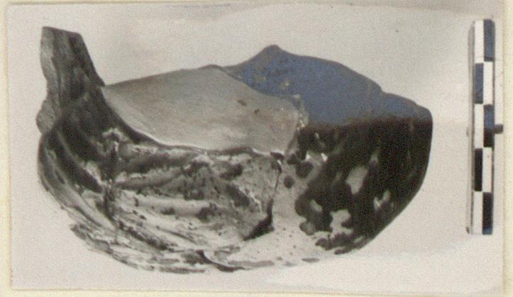 | Description: | Mended from several fragments, one piece not joining. Fragment of curved neck of heavy pot, rhyton(?). Domed partition across one end, pierced with large hole next to inner side of neck. Other end decorated with large moulded palmettes. Single fragment decorated with palmette and heavy horizontal, twisted cord motif. Very poor black glaze over all; traces of white paint. ADDENDA Rhyton terminating in sea monster (triton?). Part of hole for spout present. b) probably joins a) giving part of body of triton(?). Very similar: Bull. Soc. Royale d'Arch. d'Alexandrie n.s. vol. X, 2 (1938-1939), no. 33, p. 353, fig. 2. | |
