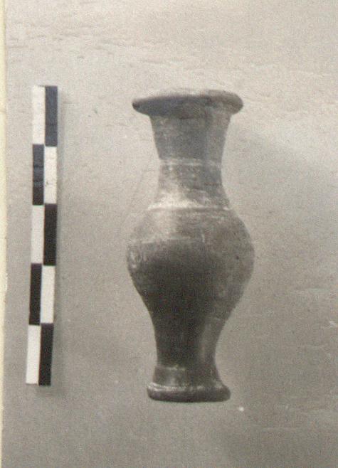 | Description: | Intact except for chip. Dropped rim; flaring ring foot. Fusiform. Three bands of white paint, one on neck and two on body. Gray-buff clay. | |