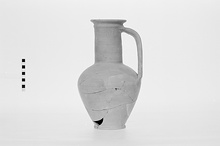 | Description: | Mended from many fragments; much of wall missing. Tall pitcher with small ring foot, straight sides, rounded shoulder, very high cylindrical neck with ridge just under projecting rim of mouth. Heavy vertical band handle with slight depression at middle, attached under rim and to shoulder. Coarse pinkish-buff clay. | |
