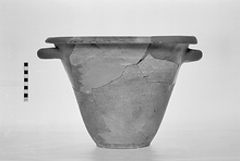 | Description: | Mended from many pieces; most of rim and part of walls missing. Restored in plaster. Flat bottom with small projecting base; walls slightly curved near base, flaring to curved, out-turned rim; attachment for handle preserved just under rim. Coarse clay shading from yellow-buff to light orange outside; rim and inside covered with dull red to black glaze. ADDENDA Restored, but handle probably should have been restored more like P 18774. | |