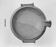 Description:   Mended from several pieces; large part of floor and wall missing. Restored in plaster. Large shallow basin with small foot, sloping walls, and wide, out-turned rim; two long lug handles on upper edge, two vertical grooves at each end of lugs; open spout on one side.