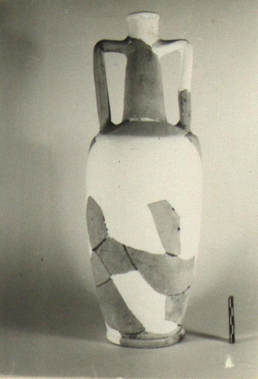| Description: | Full profile preserved. Many pieces, including all of lip and upper half of one handle, missing. Restored in plaster. Ring foot; narrow almost straight-sided body with angular shoulder and narrow tapering neck; grooved strap handles from below rim. Soft light gray to white clay. | |