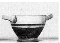 Description:   Complete except for one handle and small fragments of body. Flaring ring foot and very slightly projecting rim, flat on top. Band handle at rim.