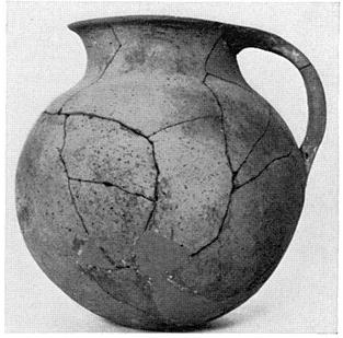 Description:   Small fragments of body missing. Spherical body with rounded bottom; one band handle and round mouth.