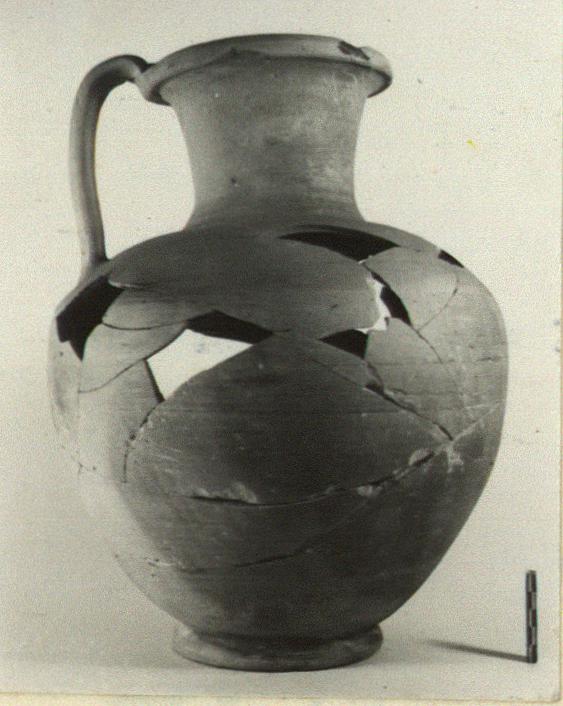 Description:   Several wall pieces missing. Ring foot; ovoid body; handle from slightly above shoulder, to lip. Medium neck. Round mouth with projecting rim with angular profile.