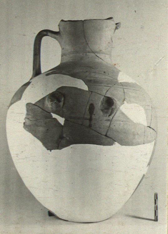 | Description: | The body fragmentary; restored in plaster to near the base (missing); both horizontal handles broken off. Plump ovoid body; band handle from below rim; broad projecting rim, slightly flaring. Micaceous clay, gray at core, reddish at surfaces, covered with thin creamy slip, much worn. The rim glazed and glaze bands around neck, shoulder and body; vertical bands on the handle, crossing near the lower attachment and with two horizontal bands above. | |