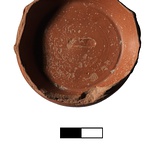 | Description: | A single fragment preserves foot and some of lower body of a Samian bowl. At center of floor a foot stamp, apparently without letters. On bottom a graffito: <graphic> Micaceous cinnamon clay and glaze. | |