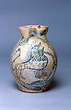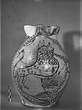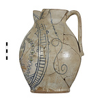 | Description: | A fragment of the rim and one of the neck missing. Low base with flat under- surface, unglazed. Swelling sides, trefoil lip, ribbon handle. In an oval frame with transverse bars between double lines is a lion marchant right with uplifted, curling tail and bristling mane. His mouth is open and shows two rows of teeth. From behind issues a fanciful curving design, perhaps intended to represent a vine-stem. Below the ground line, two double wavy lines may represent water. Other loops and triangles hang in the field from the oval frame. Outside of the main design on either side, spiral and tuft patterns. The chief outline of the drawing is done in blue; the scales and spots of the lion are alternately blue and green, as are the segments of the vine(?) tendril. Buff clay; yellow glaze on interior; white on exterior. | |