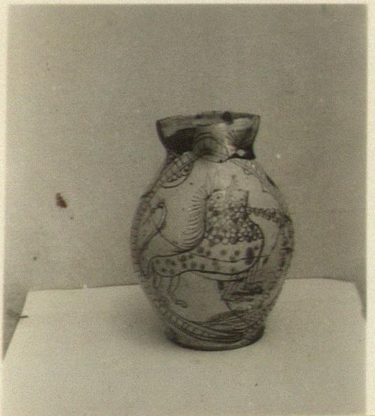 | Description: | A fragment of the rim and one of the neck missing. Low base with flat under- surface, unglazed. Swelling sides, trefoil lip, ribbon handle. In an oval frame with transverse bars between double lines is a lion marchant right with uplifted, curling tail and bristling mane. His mouth is open and shows two rows of teeth. From behind issues a fanciful curving design, perhaps intended to represent a vine-stem. Below the ground line, two double wavy lines may represent water. Other loops and triangles hang in the field from the oval frame. Outside of the main design on either side, spiral and tuft patterns. The chief outline of the drawing is done in blue; the scales and spots of the lion are alternately blue and green, as are the segments of the vine(?) tendril. Buff clay; yellow glaze on interior; white on exterior. | |