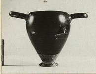 | Description: | Mended complete from several pieces; a few small bits missing. Thin-walled Corinthian type, sharply drawn in at the rim and above the flaring foot. The handles spreading sharply from the attachments, and squared at their ends. Reserved: a band inside the rim; the insides of the handles and the space between their attachments; the space above the foot, cross-hatched; and the space within the foot beneath; decorated with two glazed circles. Firm glaze, black above; brown below a stacking line well up on the body. Cf. Agora XII, no. 327. | |