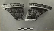 | Description: | Two fragments from opposite sides of the rim of a red figure volute krater. Lip flat on top, projecting; its outer face decorated with a single maeander. a) Mended from two pieces. On the top of the lip a trace of the attachment of the volute and, below, part of the reserved handle space. The full height of the upper ornamented band preserved. Single lotus and palmette pattern, the palmettes encircled; the pointed lotus tips balanced by spirals. b) Double chain, lotuses and palmettes alternating, above and below. Elaborate and careful work; relief contours. | |