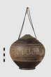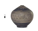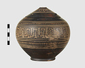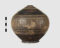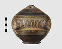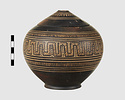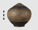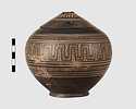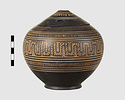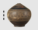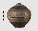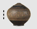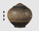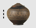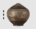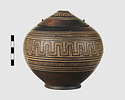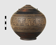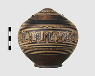 | Description: | Deep rounded pyxis on slightly flaring ring foot; the rim flanged inside to receive the lid and the flange pierced by two pairs of tie holes. The foot and lower body glazed, also the flange and a zone below the rim. A wide reserved zone at the shoulder and below, divided by triple horizontal lines (double line at the top) into a wide zone between two narrow ones. In the wide central zone, a band of hatched key pattern, with vertical dot rows in the bays between the keys. A zigzag in the upper narrow one; a row of short parallel verticals in the lower. The knob handle of the conical lid missing. Two pairs of tie holes pierced through near its plain edge, corresponding to those of the flange of the pyxis; no marks to indicate corresponding pairs. The lid glazed outside except for a zone below the handle decorated with tooth pattern; a single line below, and a triple line above (probably double, if the glaze at the upper edge continued up to the handle). Solid, rather dull black glaze with reddish-brown mottling, continuous between pyxis rim and lid, suggesting that they were painted (or fired) with the lid in position. | |