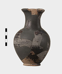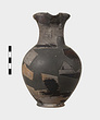 Description:   Mended from many pieces, some burned and some not; much of body and shoulder, and most of handle missing but profile complete. Low, slightly flaring ring foot and plump ovoid body; slightly concave neck and trefoil mouth. Solid, rather dull glaze over all, black shading to reddish-brown and somewhat peeled especially when burned. At the level of greatest diameter a reserved zone, bordered above and below by triple horizontal lines, and decorated with sets of opposed diagonals, the triangles between sets filled in with glaze. A reserved zone around the neck except under the handle, decorated with a hatched maeander running left between triple horizontal lines above and below. Ladder pattern on outer face of band handle.