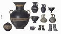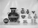 | Description: | Mended from many fragments, most burned, some not; large parts of the body and all of the handle missing. Restored in plaster. Low slightly flaring ring foot and round body with level of greatest diameter low; narrow neck and shallow trefoil mouth. Glazed to level of greatest diameter; below the shoulder a hatched maeander running left between triple lines below and double above. Latticed triangles on the shoulder (four). The neck narrowed and bordered above and below by double lines; between them a triple band of key pattern. The mouth, and the neck under the handle, glazed. Clay buff to gray when burned; thick black glaze, badly peeled: a narrow reserved zone filled by a horizontal line around the lower body above the foot. | |