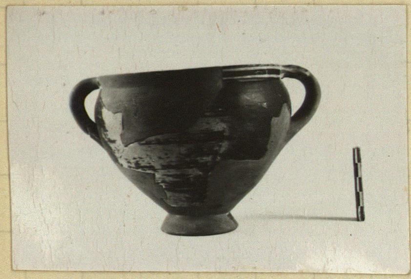 | Description: | Large part of body, rim and foot restored; also both handles, except for stumps. High flaring ring foot and deep rather pointed body with short rim, nearly straight, and vertical band handles. Thick rather dull glaze over all, black to reddish-brown; two reserved lines on outside, and one on inside, of rim. Inside grayed, with reserved dot at center of floor. | |