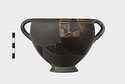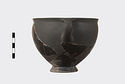 | Description: | Mended from many pieces, some burned and some not. Profile complete with one vertical handle; but most of body at one side, and of foot missing. High flaring ring foot, deep rather pointed body; short rim. Body entirely glazed, except for short rectangular panels reserved at center of handle zone front and back, and decorated with sections of quadruple key pattern. Two reserved lines outside, and one inside the rim; inside glazed, with reserved dot at center of floor. Ladder pattern on the outer face of the handles. Thick solid rather dull black glaze, somewhat peeled when burned. | |