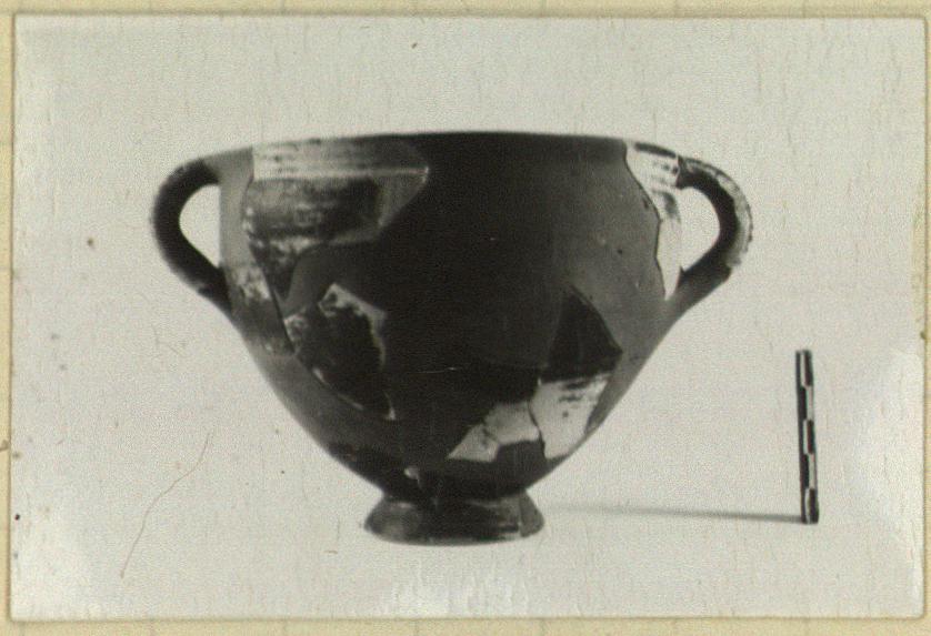 | Description: | Mended from many pieces of which several do not join; profile restored by patching. High flaring ring foot, deep rather pointed body, short rim and vertical band handles. Glazed over all; reserved rectangular panels front and back at center of handle zone, probably decorated with multiple key pattern; ladder pattern on handles, double lines on reserved rim. Inside glazed, with reserved line at rim and dot at center of floor. Clay buff, or gray from burning; solid rather dull black glaze, peeled where burned. | |