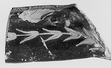 | Description: | Broad band handle; one attachment preserved. Lower edge of handle rounded; the upper flattened, reserved and decorated with a large egg pattern in black, the hearts of the eggs in added clay with traces of gilding. Inner broad face unglazed, covered with white sizing with considerable remains of red paint over. The outer face glazed, chocolate brown, and decorated with a garland of pairs of pointed leaves in added clay; traces of gilding. Cf. P 1499 and P 14569. | |