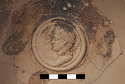 | Description: | Several pieces preserve floor and about half of wall and rim. Very low ring foot; gently curving walls, plain rim. On floor a raised medallion: within a single groove, profile bust of Augustus with fillet, left. Light reddish-buff clay; glazed over all, baked red to black outside, dull black to brown, flaked, inside. Cf. P 9059, with handle. Cf. Williams (1998), EMC/Classical Views 42 (1998), pp. 321-336. Cf. Archontidou, et al. (2001), Ενα Λουκουλλειο γευμα, p. 22. | |