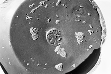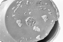 | Description: | The ring base and part of the steep sides of a Western Sigillata bowl. In the interior of the bowl, not quite in the center, is a circular stamp carelessly impressed: <graphic> Red-brown clay; good red glaze. | |