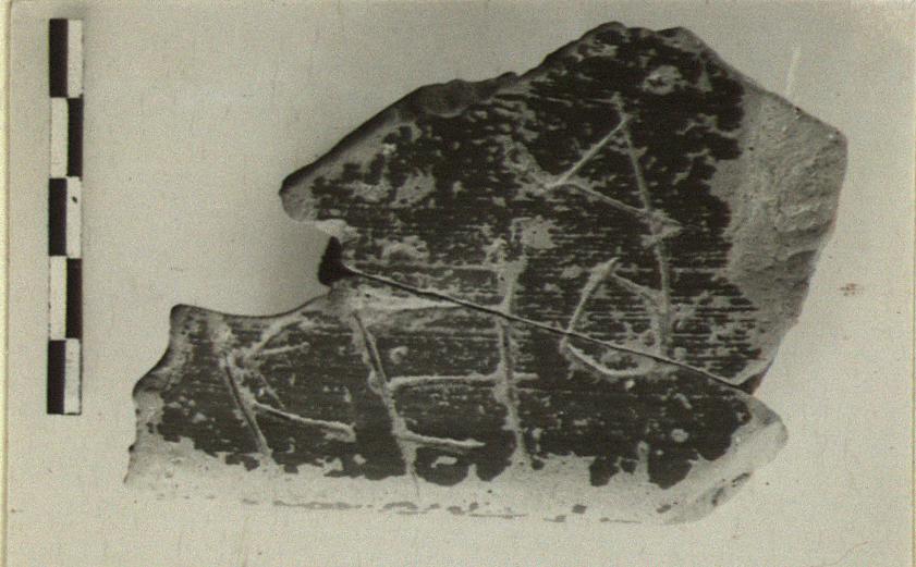 | Description: | Mended from two pieces. Rim and upper wall fragment of a semi-glazed krater, the rim lightly rounded on top but not overhanging. Incised on the inside: <graphic> Red glaze, worn, inside on rim and for a band outside. | |