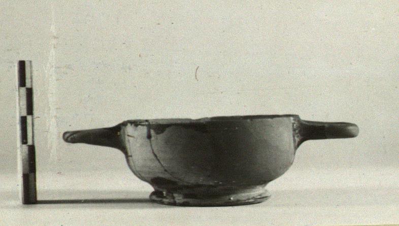 | Description: | About half the body and most of the handle missing. Bolsal type. Ring foot, flaring; plain rim; handles drawn in at attachments. Much peeled black to brownish glaze over all. Cf. Agora XII, nos. 540, 556. | |