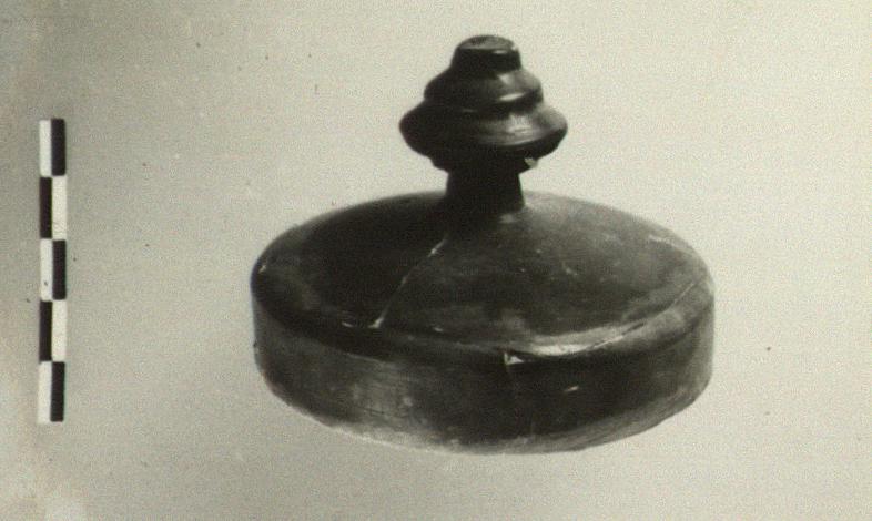 | Description: | Fragments of rim missing. Plain slightly convex lid with downturned rim and stemmed knob handle, the knob moulded in three degrees. Black to brownish glaze over all. | |