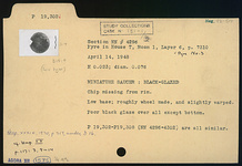 | Description: | Chip missing from rim. Low base; roughly wheel made, and slightly warped. Similar to P 19303-P 19308 (ΝΝ 4297-ΝΝ4302). Poor black glaze over all except bottom. | |