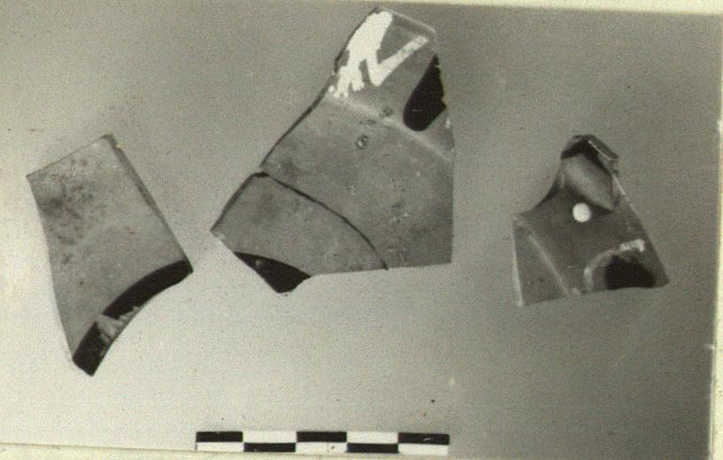 Description:   Three non-joining fragments from a plate similar to P 19322, P 19323 (ΝΝ 4319- ΝΝ 4320) but more carefully made and decorated on the rim with glaze bands and bird-like(?) ornament added in white.